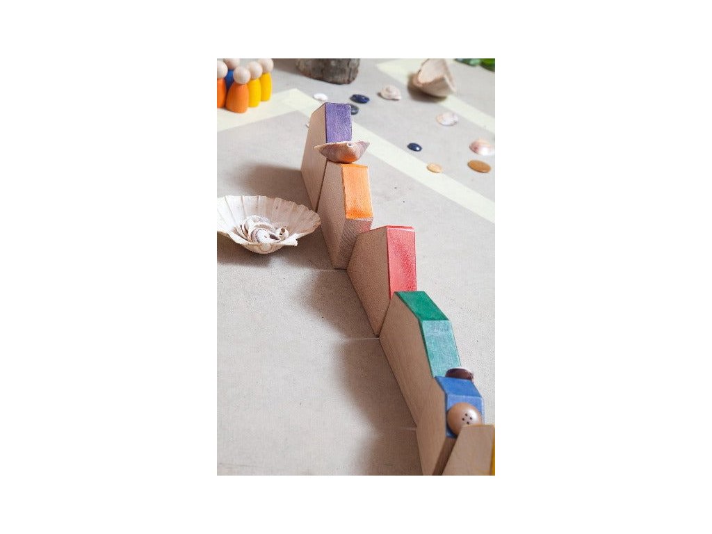Dřevo používané na hračky Grapat (především buk a bříza) pochází z trvale udržitelných lesů. Dřevo je zdrojem, který dílnu denně inspiruje. Je robustní, měkký a tvrdý, je hřejivý, dobře zní a voní. Barviva jsou na vodní bázi a netoxická: umožňují prosvítat kresbě dřeva a přivádějí děti do bližšího kontaktu s přírodou. Povrchové úpravy jsou vyrobeny z vosků a olejů rostlinného původu. Oleje mohou mít zpočátku silné aroma, které však během pár dní ztratí. Každý kus je jedinečný, každý je ručně malovaný. A přirozené nedokonalosti jsou uznávány jako součást přírodního dřeva: je krásné a činí materiál ještě cennějším. Pro péči nebo čištění dílů otřete vlhkým hadříkem a ihned osušte.